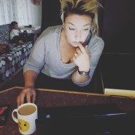 Sy loop om en soen haar ma. Sy is op die foon en langs haar n koue koppie koffie en ń asbakkie vol ou sigarette. Sy hoef nie meer haar ma sin te steel nie wat sy koop nou haar eie. Hulle weet sy rook. Sy stap nader en groet haar pa. Sy soen hom en hy druk haar boud.